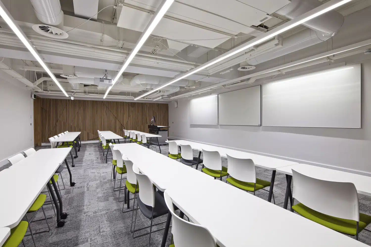 Excessive levels of noise reverberation is often a consequence of sound reflecting off hard interior surfaces such as bare floors, walls and hard furniture like tables, chairs and counters. This is a very common setup in classrooms.