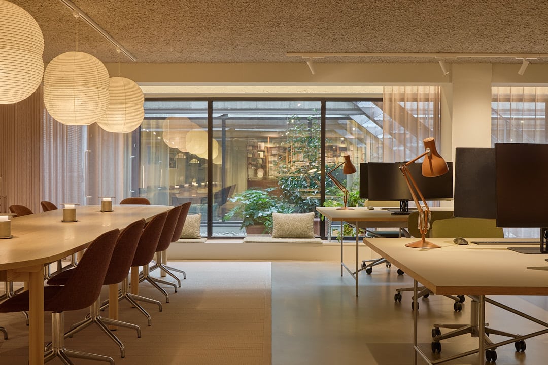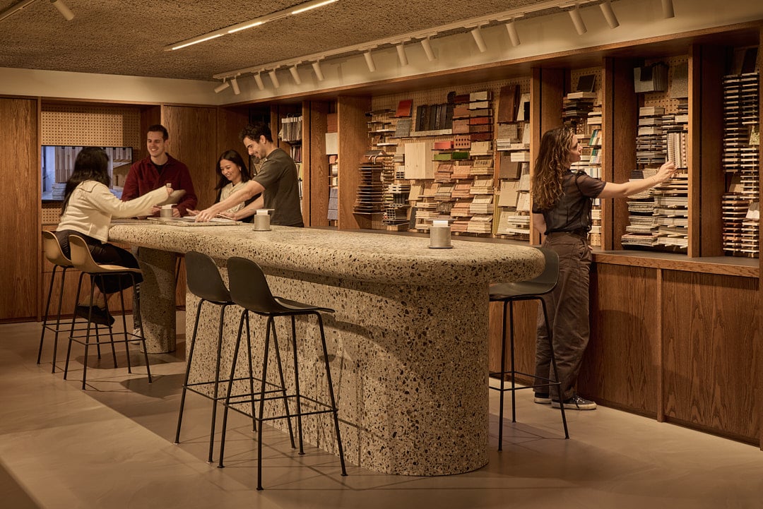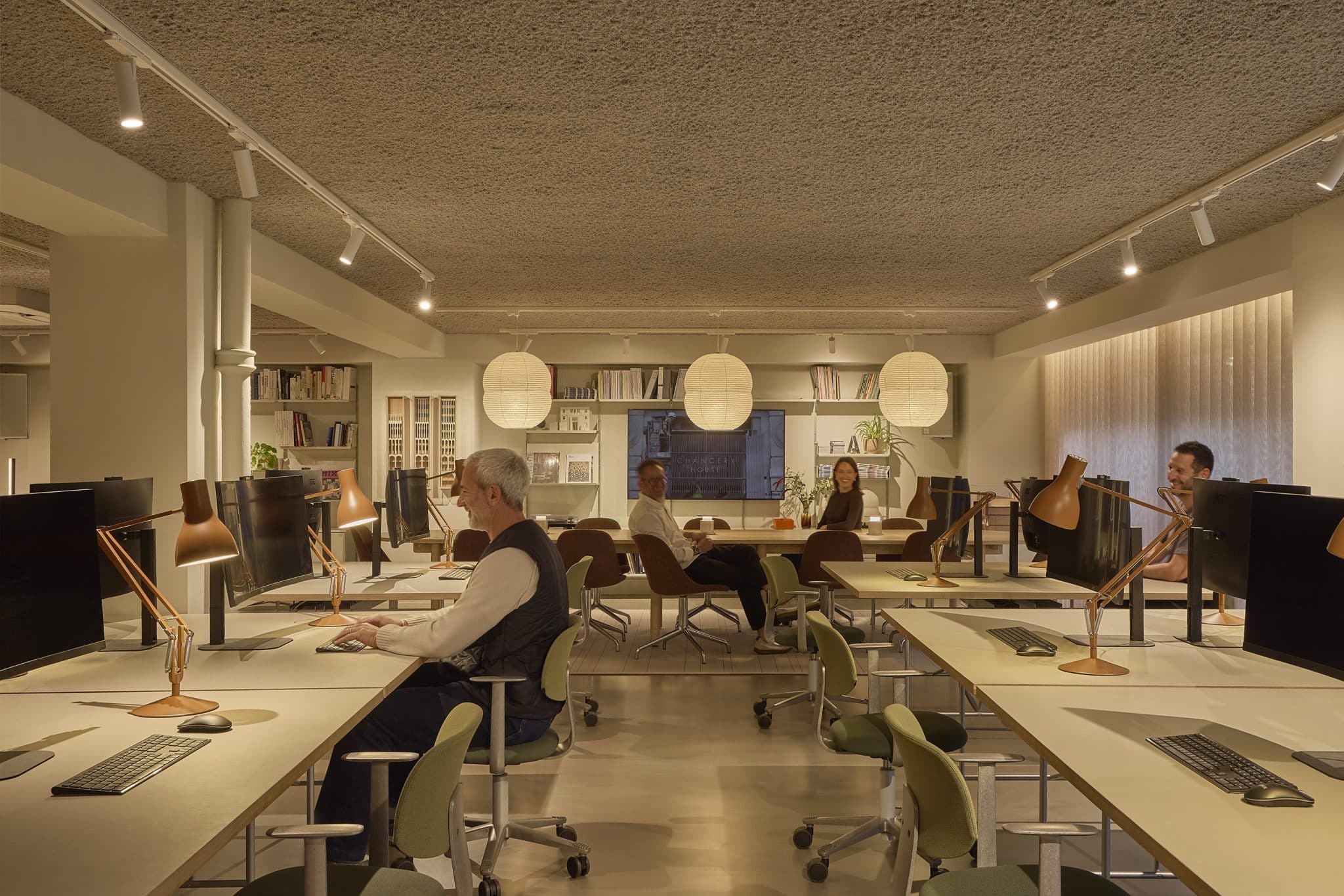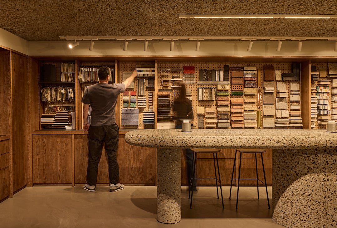 The acoustic performance supports every function. When voices fill the room during design talks, the ceiling absorbs and balances the sound. When the space falls quiet for focused work, there’s no echo to break concentration. The Eco+ finish functions brilliantly, while adding the kind of character conventional acoustic treatments can’t match. Those visible newsprint flakes are proof of sustainable innovation, combining performance with personality.