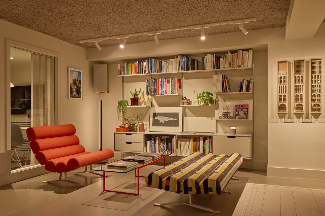 Downstairs at dMFK certainly earns its keep. By day, it’s a workspace with bigger desks and better acoustics than standard offices provide. The design prioritises wellbeing; calm finishes, thoughtful zoning, and informal areas that encourage collaboration and material exploration. By evening, it can host informal suppers, industry roundtables, or function as a full-on party space. The space features a D&B Audiotechnik sound system, repurposed from its previous life at Spiritland, Royal Festival Hall. Sonaspray Eco+ creates an almost studio-like, soft acoustic quality.